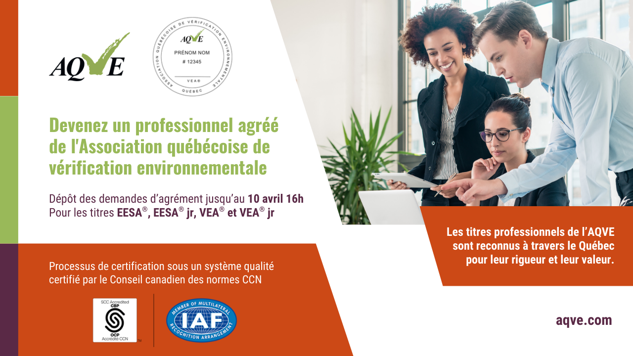 Chef de file en matière de vérification et d’évaluation environnementale de site, l’AQVE est un organisme sans but lucratif qui a notamment pour mission de regrouper les professionnels en évaluation environnementale de site et en vérification environnementale par l’entremise d’agréments reconnus par le Conseil canadien des normes (CCN), et de faire connaître les compétences des praticiens agréés. À noter que l’AQVE est le seul organisme de certification de personnes reconnu au Canada par le CCN et décerne actuellement les agréments VEA® et ÉESA®, ainsi que les agréments VEA®jr et ÉESA®jr. Une certification pour les techniciens en environnement est aussi offerte en dehors de la portée d’accréditation du CCN.